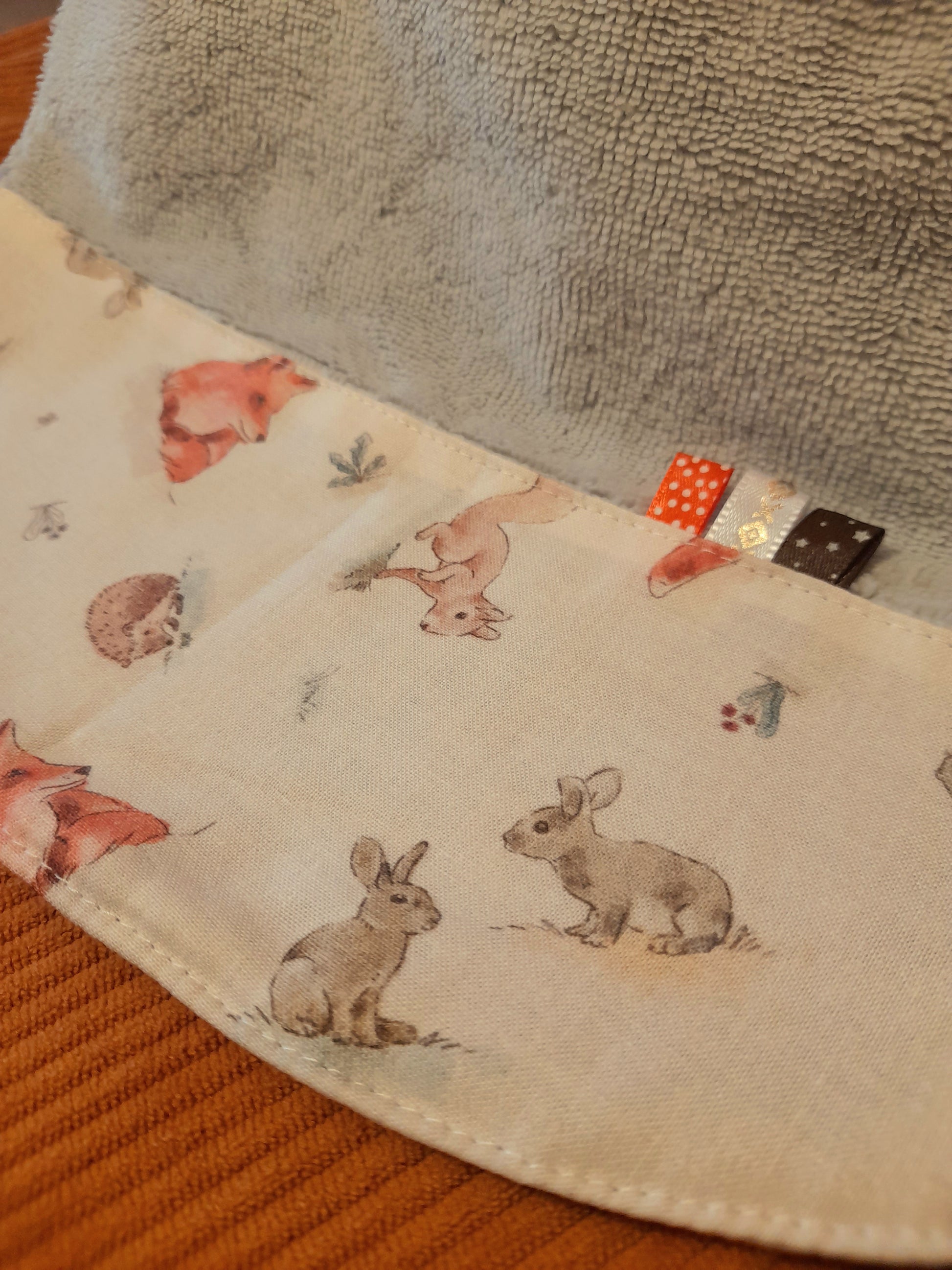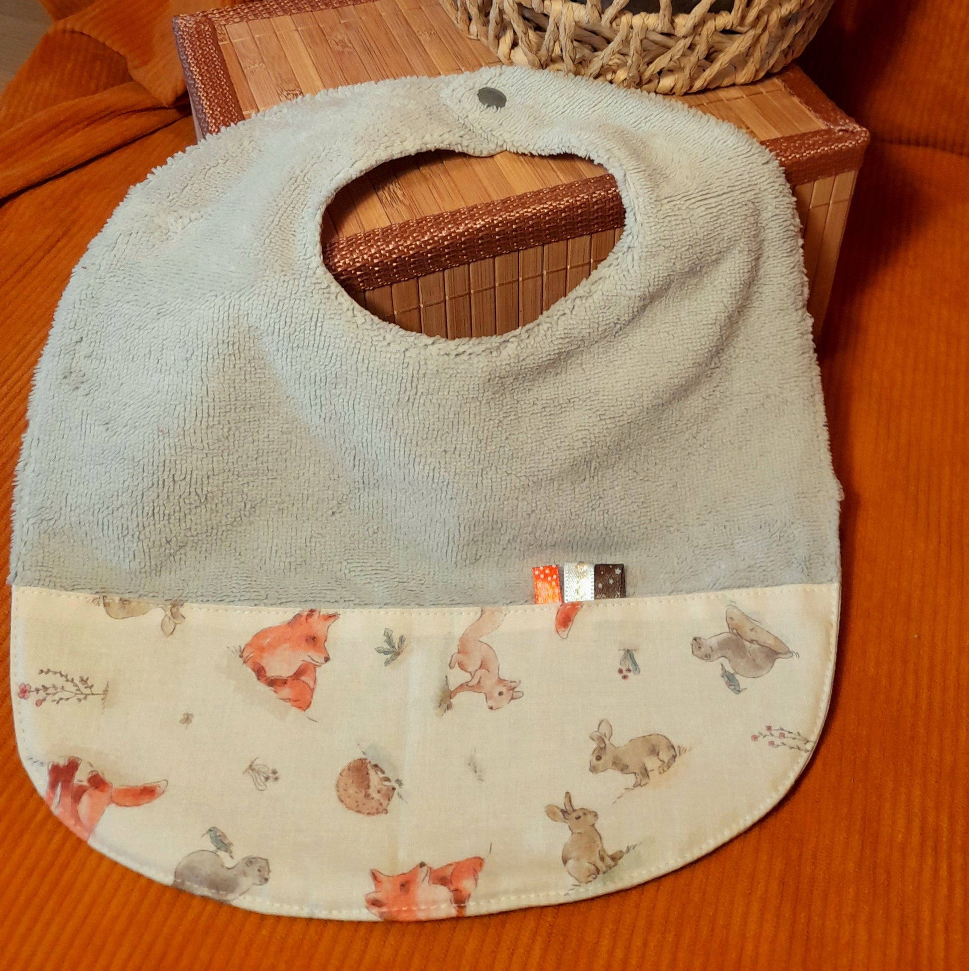 Bavoir bébé , un coté coton imprimé et un coté éponge avec empiècement coton imprimé et petits rubans décoratifs.